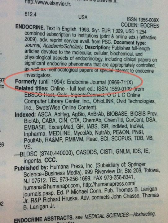 So I started looking for similarly name publications. The journal Endocrine Journal is published by the Japan Endocrine Society and the years don’t match up, so perhaps the abbreviation refers to something different? I located a journal called simply Endocrine (try finding that one in a Google search!) published by Springer. This started to look promising because the first volume of of Endocrine was published in 1993, just want we want. But this volume isn’t available on the publisher’s website, so I couldn’t confirm my suspicions.